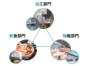 鮮魚 丸松グループでは、加工部門、飲食部門、物販部門の3つを展開。加工で鮮度を活かした商品を製造し、飲食で旬の味を提供、物販で手軽に海の幸をお届けすることで、多角的に「北陸の美味」をお届けしています。
